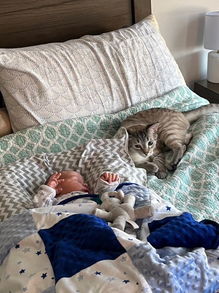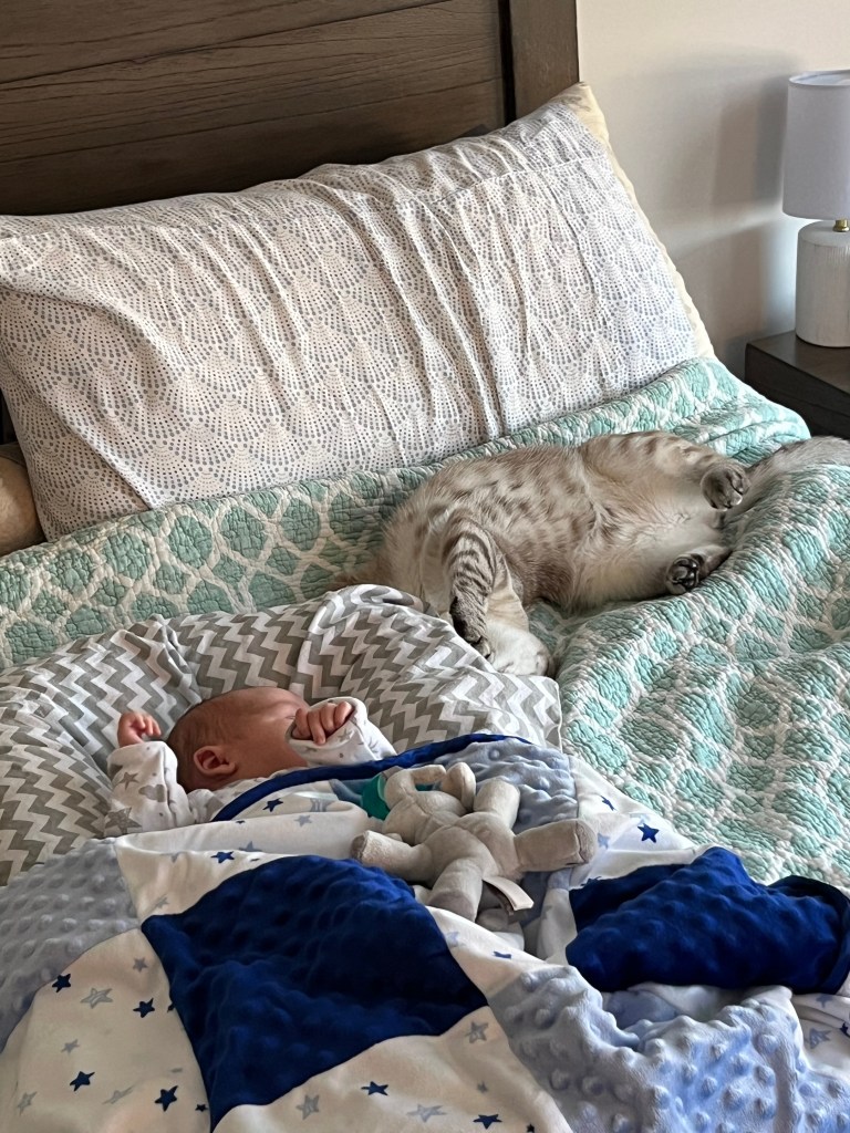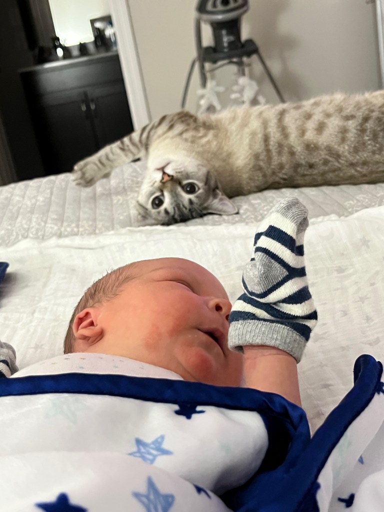 Recently, he met Baby Oliver and he has been obsessed. Like, a little too obsessed. He loves him so much it’s adorable. Sometimes he will bring the baby toys and push them closer to him. It’s so cute! Other times he is very overprotective and will lay under or next to his bassinette to make sure nobody bothers him.