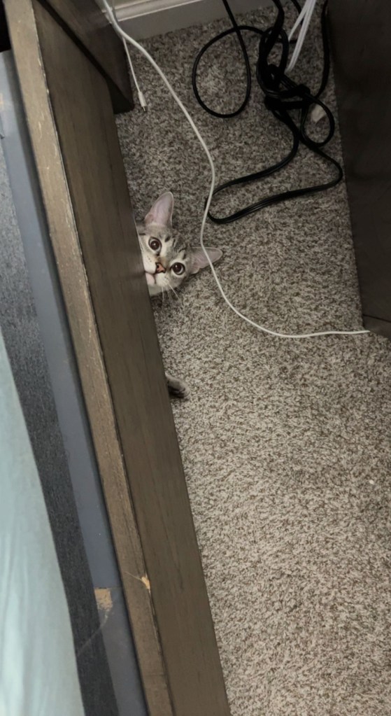 And if all of that fails, he goes under the bed, makes a lot of noise, plays with my charging chords, and pops his little head out to see if he is succeeding in annoying me (the answer is yes).