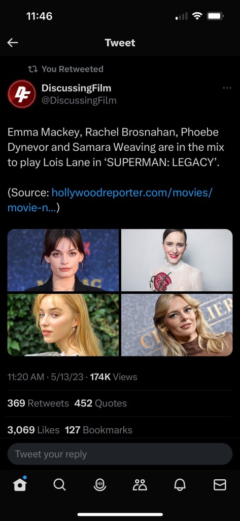 Again, I don’t know about their acting skills, I’m assuming they are good, but based on looks and comparing them to the classic Lois Lane you see in the comics, I think they could all pull it off. Honestly, I think I’d be okay with any of them being cast lol.