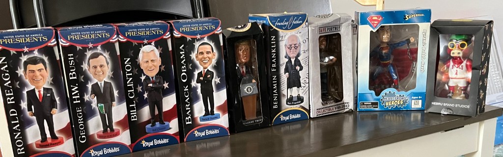 Soon after I bought the Barstool bobble, I found one of former President Donald Trump. Whatever you think of him, I believe this could be worth something some day if it stays in good condition, so I bought it. After buying that I thought “what if I had one of every U.S. President in my lifetime?” So, my bobblehead adventure began! So far I have Presidents Clinton, Obama, and Trump. I need to get President George W. Bush and President Biden still and then I will be all caught up for now lol.