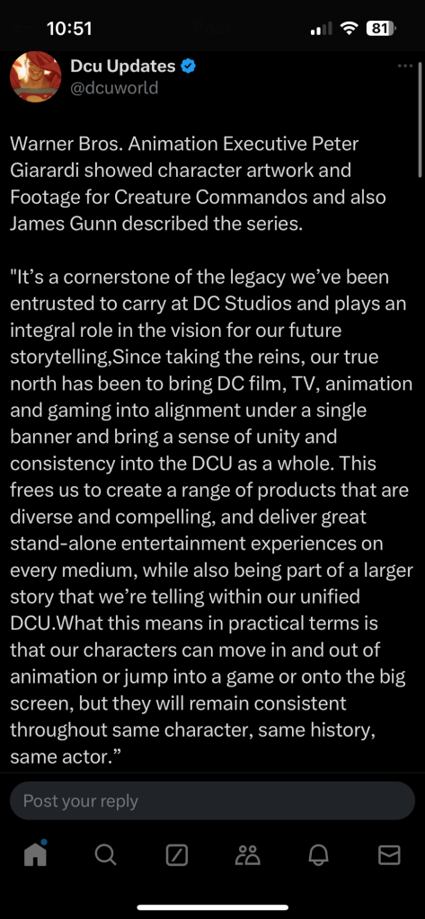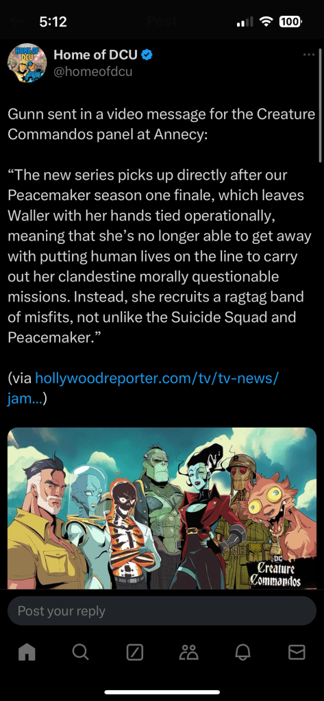 It’s a very connected universe already, I love it. Creature Commandos is said to pick up right after Peacemaker (starring John Cena) left off. You can find season one on Max as well.