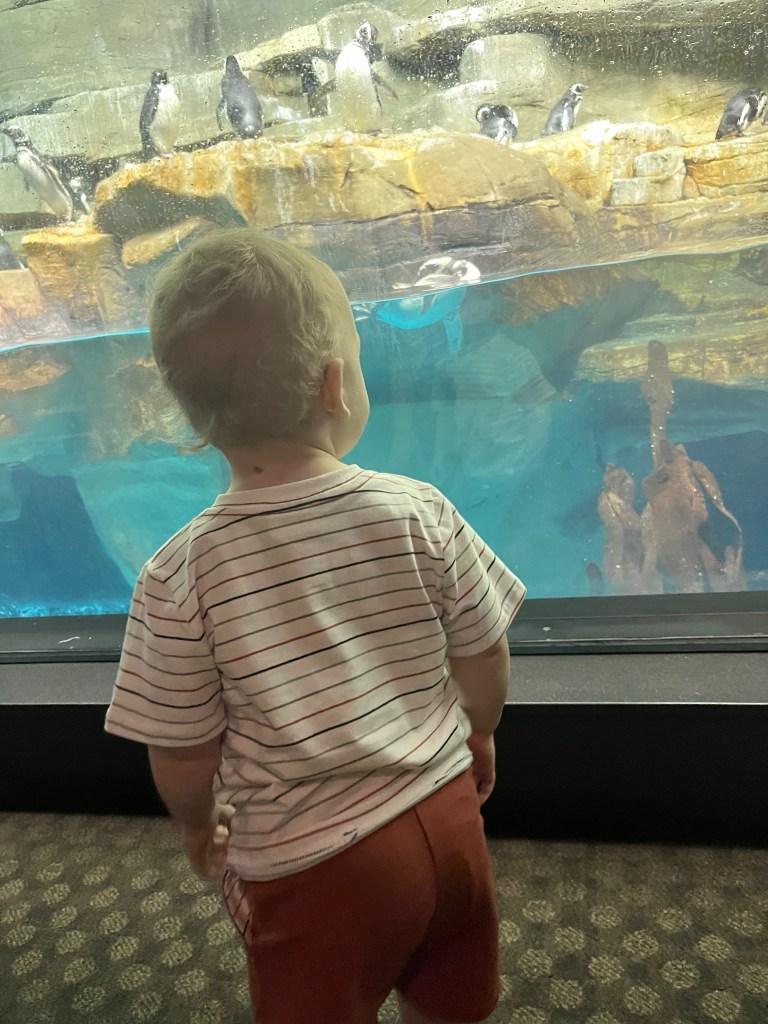 (Note to self and to whoever is reading: Don’t go to the aquarium on a holiday weekend!). It was a lot of fun but it was also very crowded. I think Baby O was a bit overwhelmed at times because of all the people and the new species he was encountering on the other side of the glass. One animal he loved were the penguins. He was so excited when they would swim up to him and splash their fins (?) around. Of course, he had to get a penguin stuffed animal before we left!