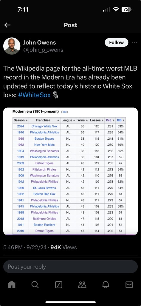 Yes, you read that right. They are now the proud holders of the “all-time worst MLB record in the Modern Era”. Great job, Jerry! Can’t wait for you to make a mockery of the Bulls organization too. What a clown.