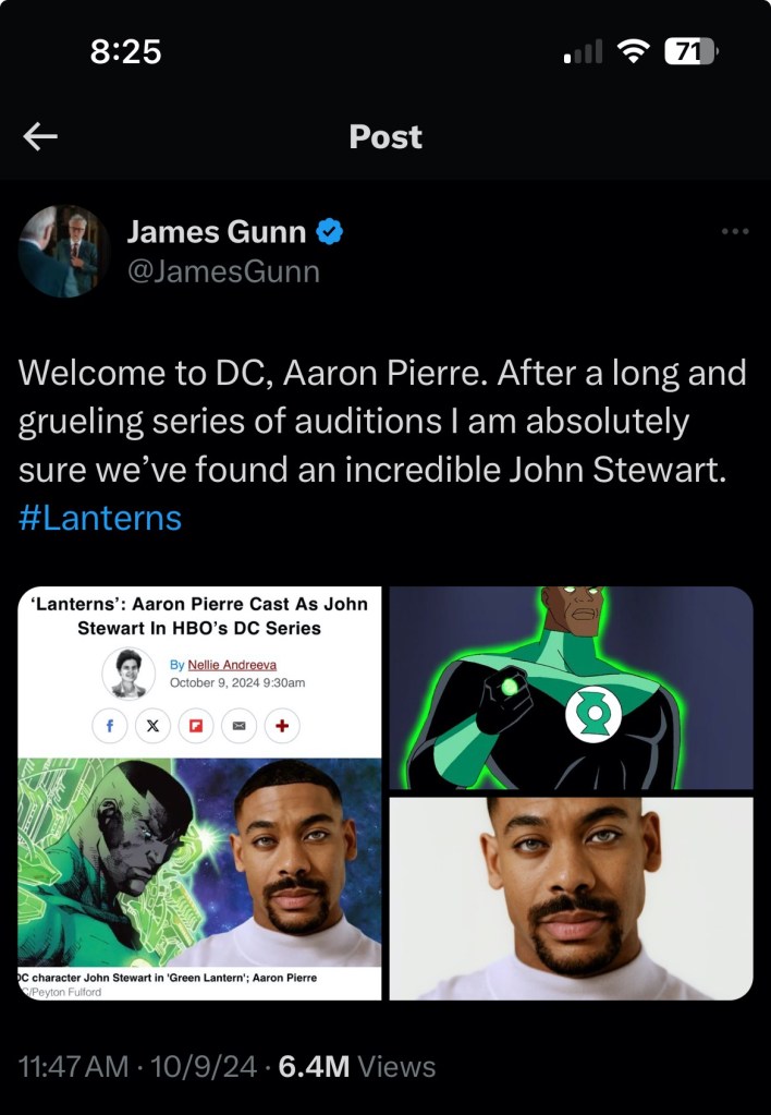 Speaking of “new recruit John Stewart”, who appears to be the main Green Lantern in the DCU as a whole….Lanterns Finds Its John Stewart with Aaron Pierre per the Hollywood Reporter. “Aaron Pierre, the star of Netflix’s Rebel Ridge, has nabbed the plum part of Green Lantern John Stewart in DC Studios’ and HBO’s much-ballyhooed series Lanterns. The casting caps one of the more scrutinized actor searches in some time. Not only is the show the first major TV endeavor from DC Studios heads James Gunn and Peter Safran, but the role of Stewart carries much significance, as the fan-favorite comic book character was one of DC’s first Black superheroes. (Hollywood reporter).”