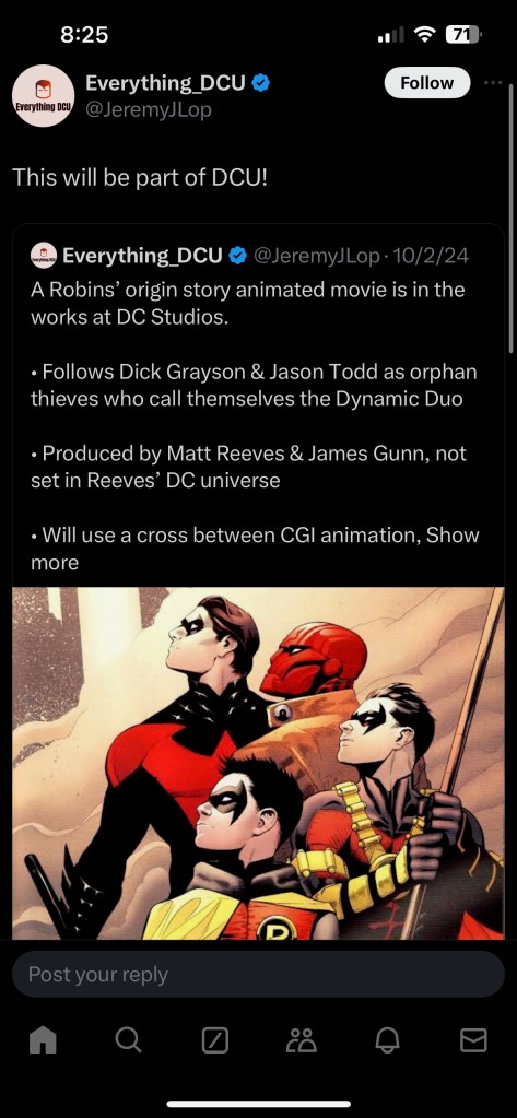 Again, I didn’t expect a movie like this so soon. It obviously ties into the Batman movie that will eventually be announced. I’ve always like Robin. Well, Dick Grayson’s version of Robin. I haven’t really payed attention to the others so maybe I should start reading lol. This will be a cool movie, and remember that the DCU project will go from live-action to animation to video game, etc. and all the same actors will play their characters in every version. It’s really going to be something special!