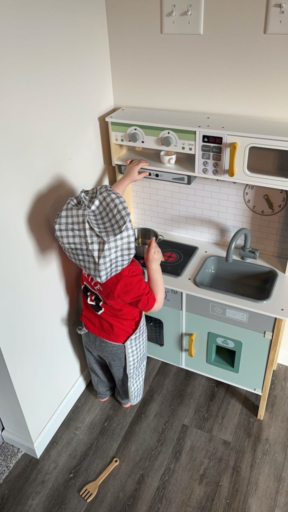 One gift he’s obsessed with came a bit late. We bought him his own little kitchen! He loves it so much.