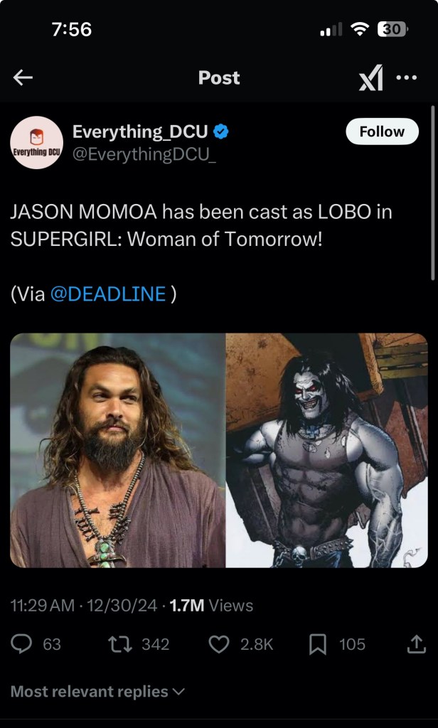 Per The Hollywood Reporter, David Krumholtz and Emily Beecham have been cast as Supergirl’s parents. Krumholtz will play her father, Zor-El and Beecham will play her mother, Alura. This was a surprise. I don’t know why, I guess I should have known they’d have her parents in the movie, but I never thought about it. It was a pleasant surprise though. Now, this next casting announcements is one of my all-time favorites. I think it’s perfect, and not just because the actor and the character look identical. Jason Momoa has been cast as Lobo in Supergirl: WOT. It’s apparently more than a cameo as well, which is awesome! If you’re unfamiliar with Lobo, he is an interstellar bounty hunter. I can’t wait to see what his part is in all of this.