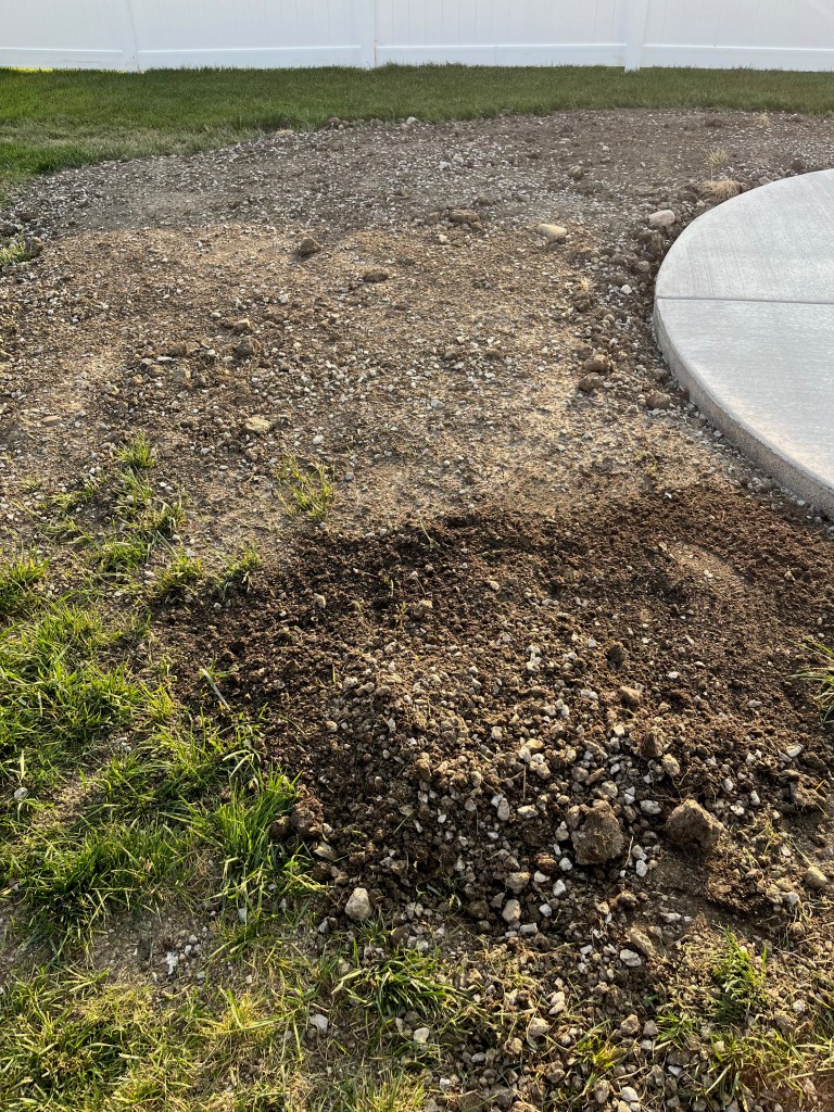 I was able to dig up a little more than what this picture shows, but I didnt realize how deep it all went. After realizing how much I am going to have to dig up, how much new dirt I am going to have to buy, and what time it was (Mr. O bed time), I decided to call it a night. I was out there for over an hour and it felt like I barely made a dent! It’s okay though. I’m not going to worry about it. I have two friends coming one weekend in the near future to help me dig it all up. I will have your “after” picture too!