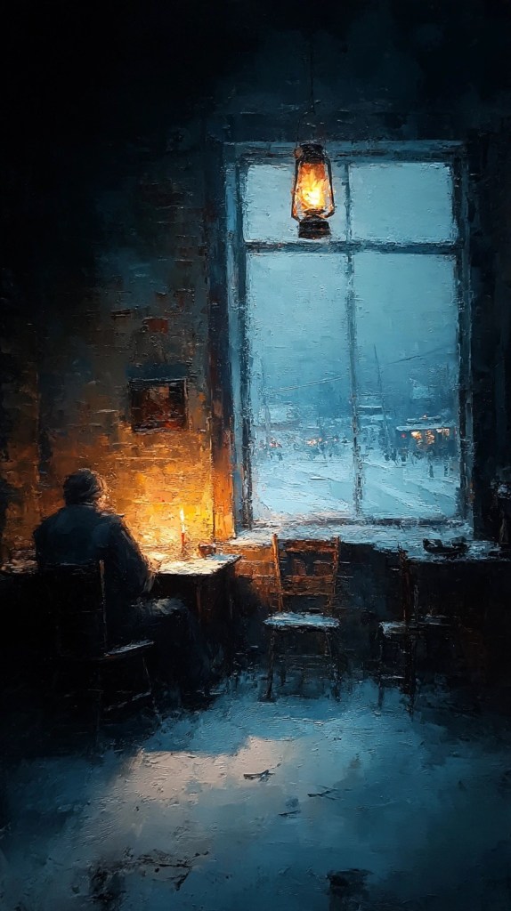 Out of the two I am sharing, this one is my favorite. Something about it; writing only with candlelight next to you, at an old desk next to a big window. The gloominess outside and the lantern hanging from the ceiling. I dont know, I find it comfortable; cozy even.
